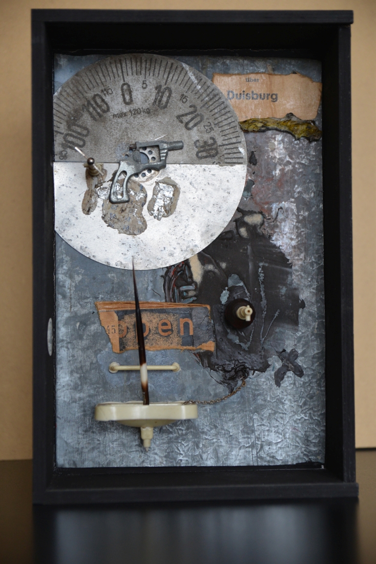 Objekte in Holzkasten mit verschiebbarer Glasfront